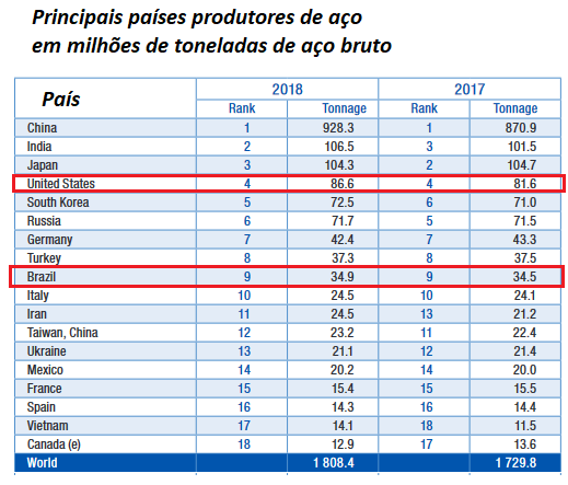 O Brasil ocupa a nona posição, mas como é um dos principais fornecedores para os EUA, é considerado o principal competidor da indústria americana de aço.