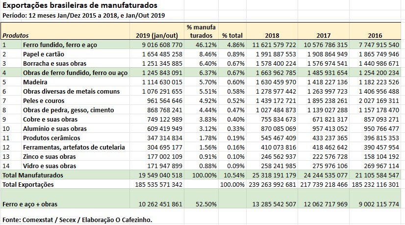- o aço é o nosso mais importante produto manufaturado de exportação. De janeiro a outubro de 2019, exportamos US$ 9 bilhões em aço, mais US$ 1,2 bilhão em obras de aço, o que corresponde, somadas as duas categorias, a 53% de todas as exportações brasileiras de manufaturados.