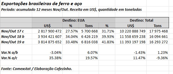 No acumulado dos últimos 12 meses Nov/Out, o Brasil exportou US$ 11,4 bilhões em ferro e aço. Apenas os EUA importaram, no mesmo período, US$ 3,8 bilhões em aço brasileiro, ou 33% de todo aço exportado pelo Brasil. A propósito, as exportações brasileiras de aço, puxadas sobretudo pela demanda americana, vem batendo recordes nos dois últimos anos.