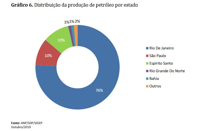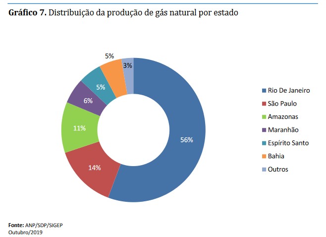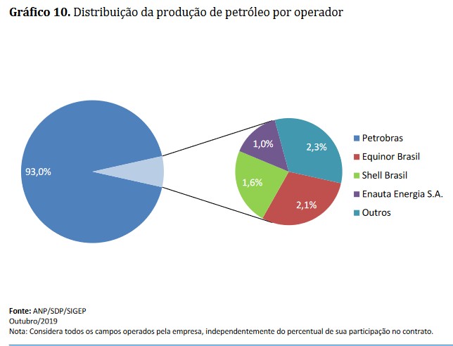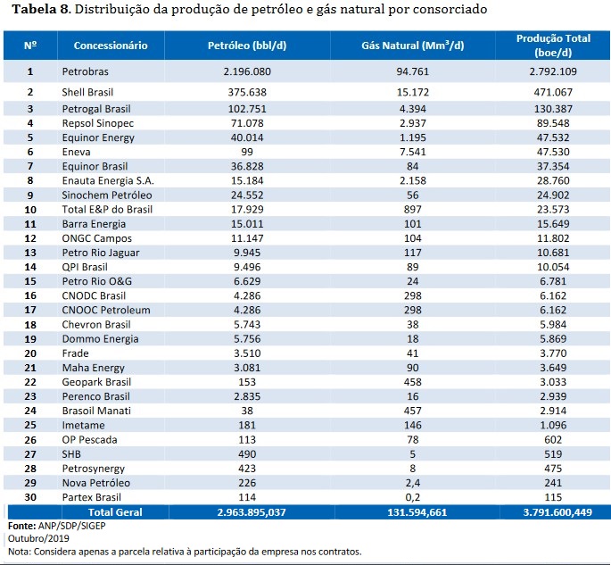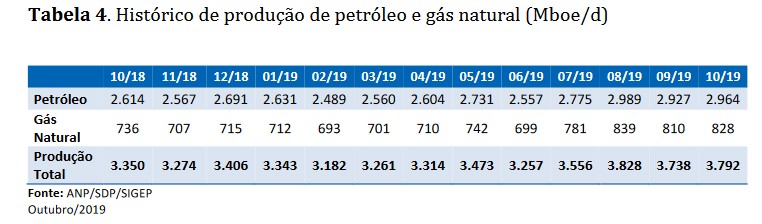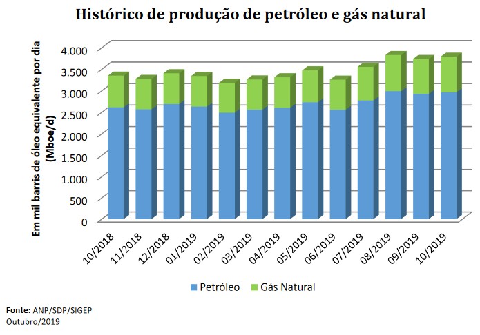 Em outubro, a produção de petróleo e gás natural no Brasil totalizou 3,792 MMboe/d, sendo aproximadamente 2,964 MMbbl/d de petróleo e 132 MMm³/d de gás natural. A produção de petróleo registrou um aumento de 1,3% em relação ao mês anterior e de 13,4% em relação a outubro de 2018, enquanto a de gás natural registrou um aumento de 2,1% em relação ao mês anterior e de 12,4% na comparação com outubro de 2018.