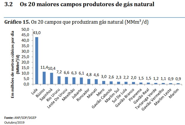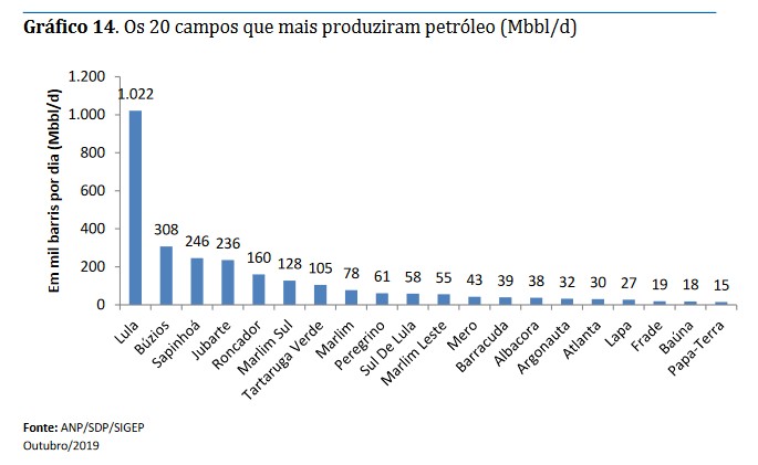 Lula, na Bacia de Santos, foi o campo que mais produziu petróleo, uma média de 1,022 MMbbl/d, e também o maior produtor de gás natural: média de 43 MMm3/d.
