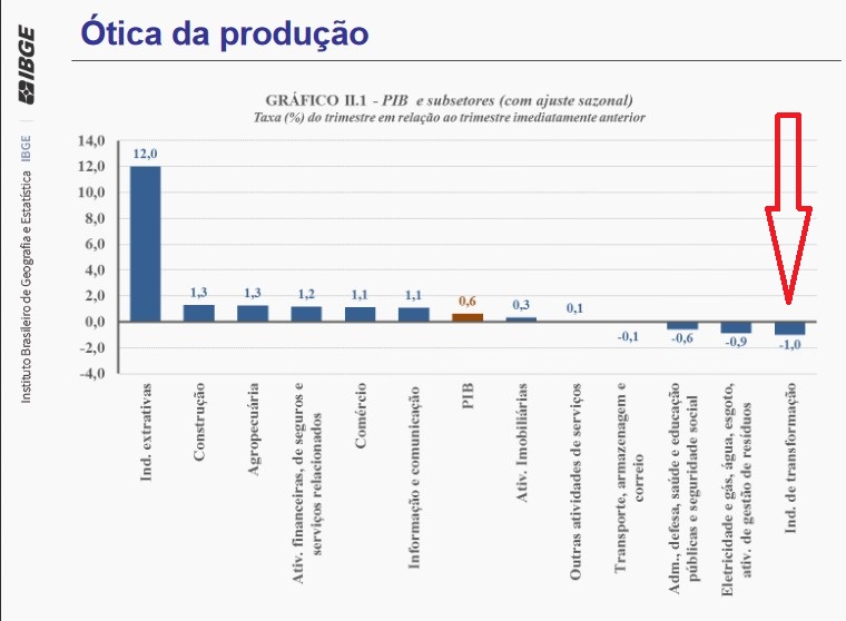 Já a atividade indústrias de transformação caiu 0,5%, resultado influenciado, principalmente, pela queda da fabricação de celulose, papel e produtos de papel; fabricação de produtos químicos; farmacêuticos e metalurgia.