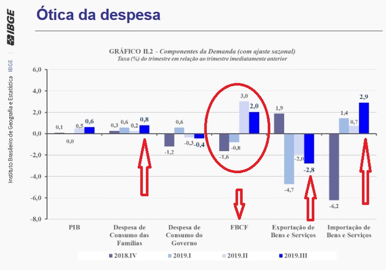 Pela ótica da despesa, o que chama a atenção é a forte queda na exportação de bens e serviços, e o aumento das importações. Há boa recuperação dos investimentos, nos dois últimos trimestres, embora o ritmo tenha arrefecido no terceiro trimestre, que cresceu 2% sobre o trimestre anterior. O consumo das famílias cresceu 0,8% no terceiro trimestre, melhor desempenho do ano.