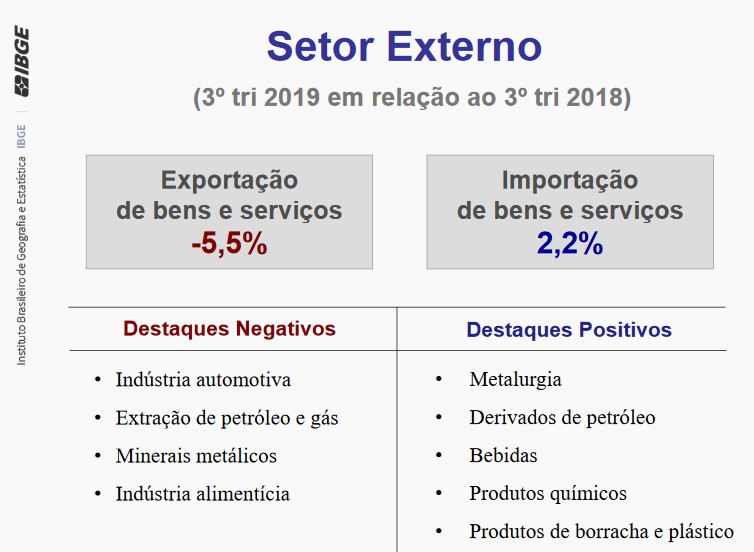 No que se refere ao setor externo, as exportações de bens e serviços retraíram 2,8%, enquanto as importações de bens e serviços cresceram 2,9% em relação ao segundo trimestre de 2019.