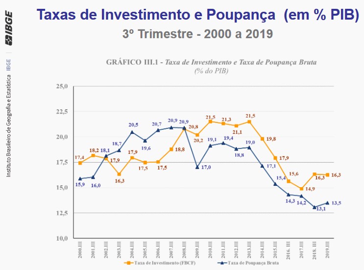 A taxa de investimento no terceiro trimestre de 2019 foi de 16,3% do PIB, a mesma que foi observada no mesmo período do ano anterior (16,3%). Já a taxa de poupança foi de 13,5% no terceiro trimestre de 2019 (ante 13,1% no mesmo período de 2018).