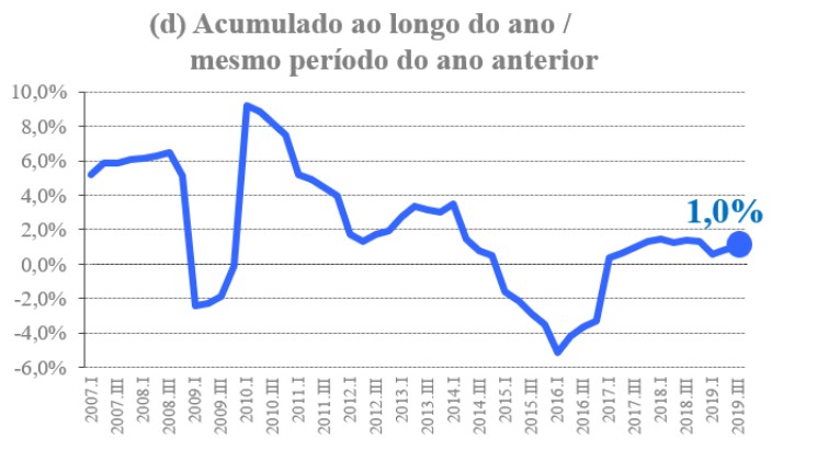 Na comparação com o terceiro trimestre de 2018, o PIB aumentou 1,2%, com a agropecuária liderando a alta com 2,1%. Conforme o Levantamento Sistemático da Produção Agrícola, divulgado em novembro pelo IBGE, o crescimento na estimativa de produção anual de milho (23,2%), algodão herbáceo (39,7%), laranja (6,3%) e mandioca (3,6%) suplantou o fraco desempenho de culturas como café (-16,5%) e cana de açúcar (-1,1%).