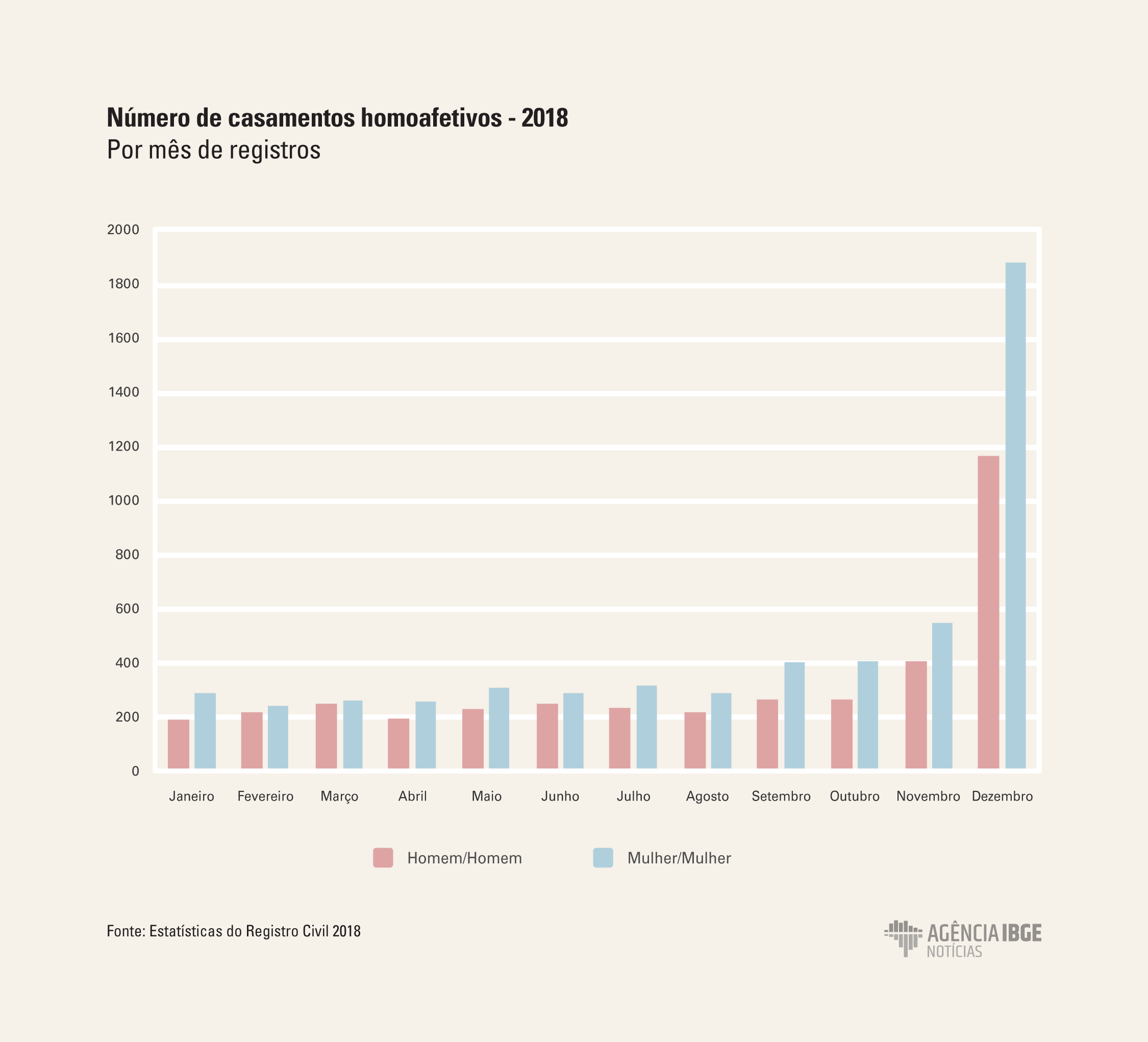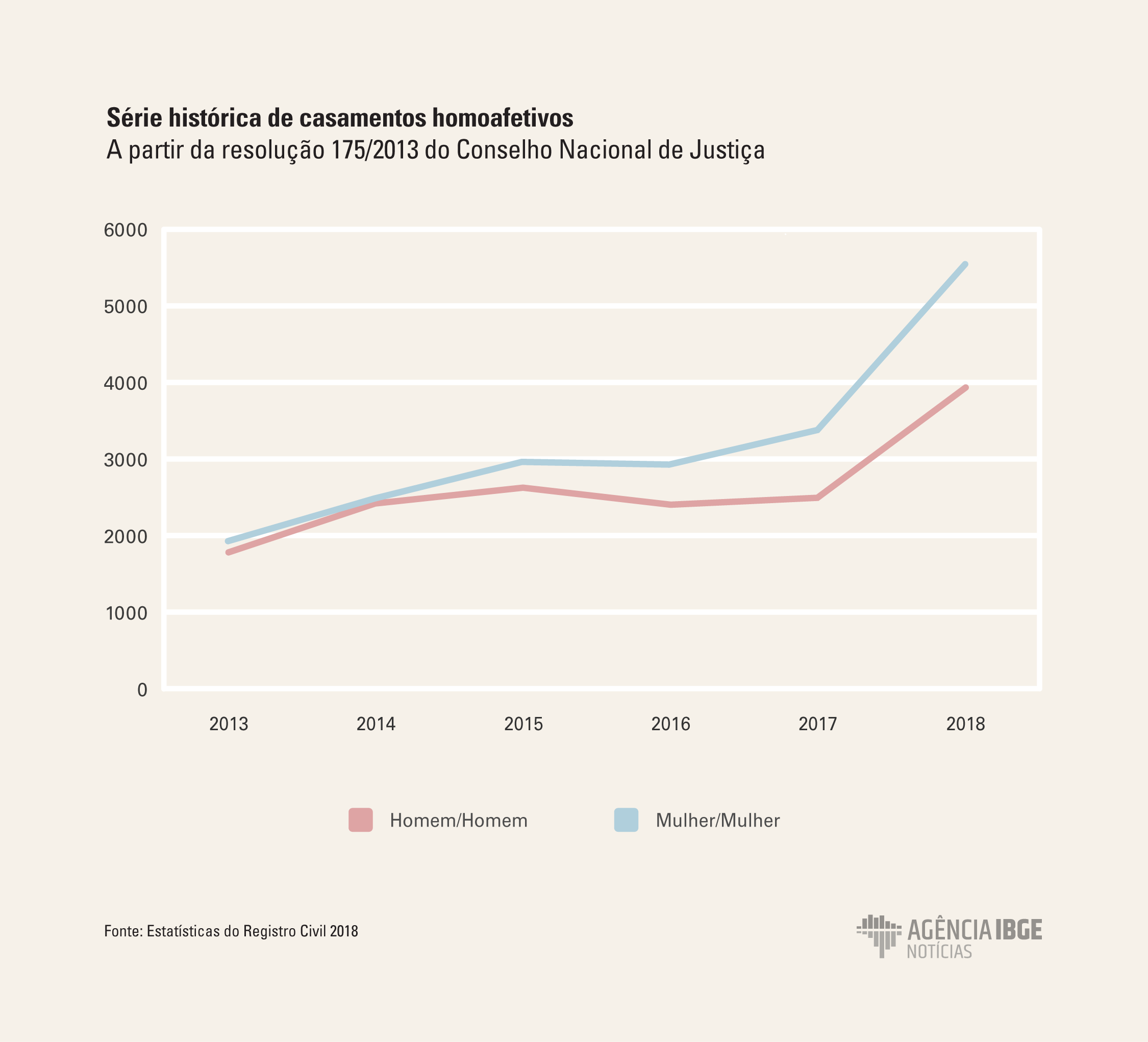 A gerente da pesquisa, Klívia Oliveira, destaca que o casamento entre mulheres foi o que mais contribuiu para o aumento das uniões civis entre pessoas do mesmo sexo. Enquanto os casamentos entre casais compostos por homens cresceram 58,3% em 2018, entre mulheres o aumento foi de 64,2%.