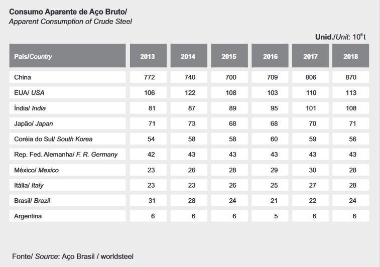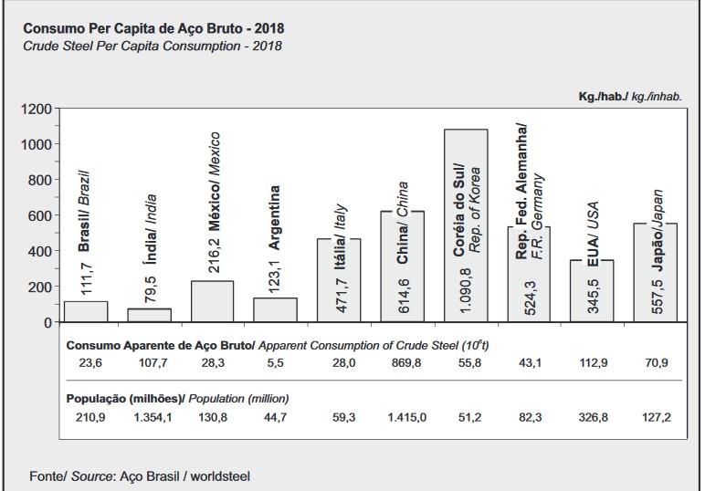 Alguns números chamam a atenção. Por exemplo, o consumo per capita de aço bruto no Brasil, de 111,7 kg por habitante, é quase 10 vezes menor que o da Coréia do Sul, de 1.090,8 por habitante.