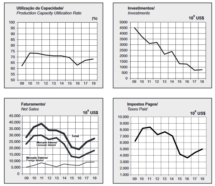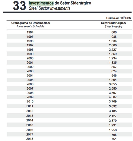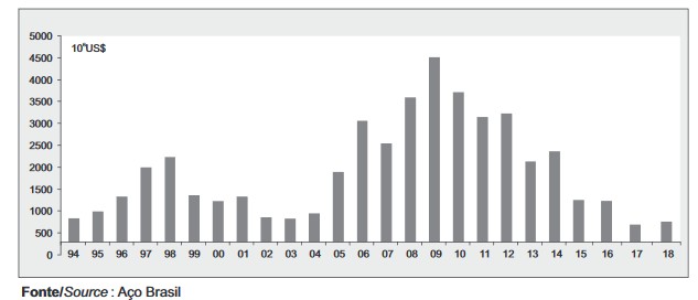 O volume de investimentos do setor siderúrgico brasileiro, por sua vez, encerrou o ano de 2018 nos menores níveis da história.