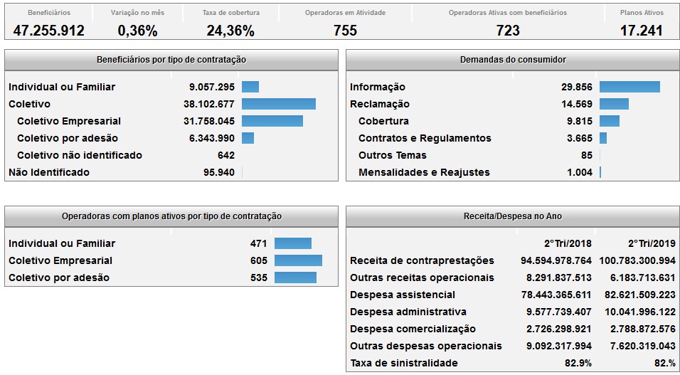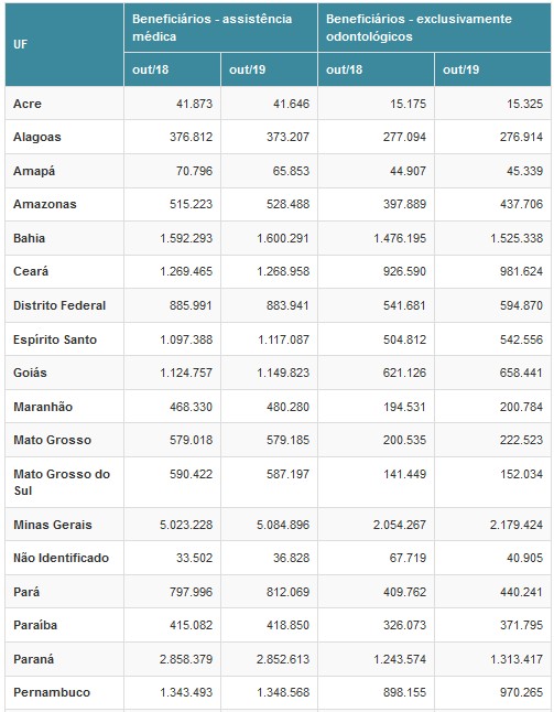 No comparativo entre outubro de 2018 e outubro de 2019, o setor registrou um crescimento de beneficiários em planos de assistência médica em 15 Unidades Federativas, sendo Minas Gerais, Rio de Janeiro e Goiás os líderes em números absolutos. Na segmentação odontológica, 25 UFs tiveram aumento, tendo São Paulo, Rio de Janeiro e Minas Gerais como os líderes em números absolutos.