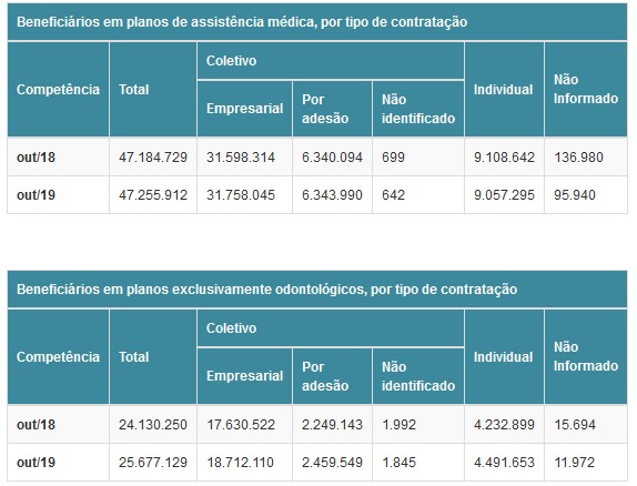 Já o segmento exclusivamente odontológico manteve sua trajetória de evolução dos últimos anos, contabilizando 25.677.129 usuários, crescimento de 1.546.879 no comparativo com outubro de 2018.