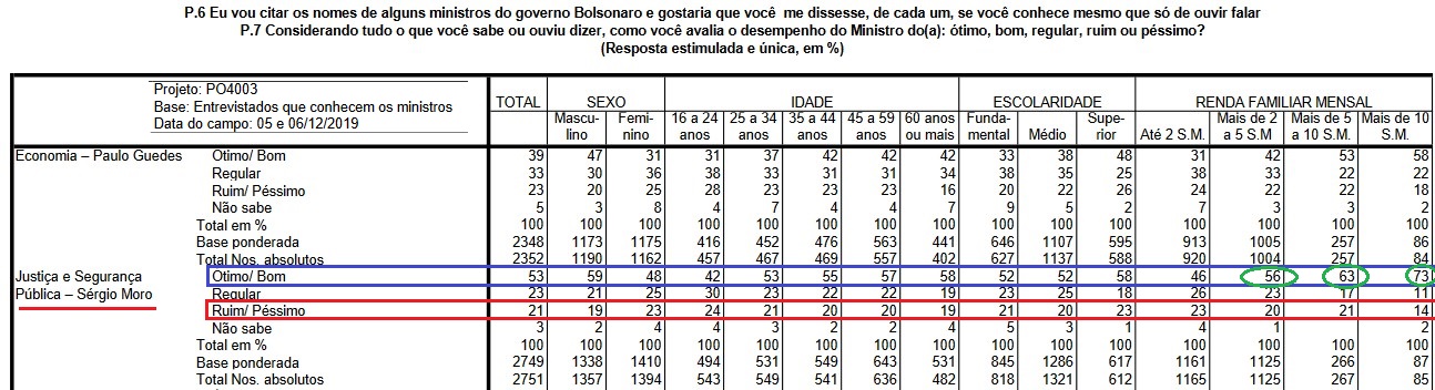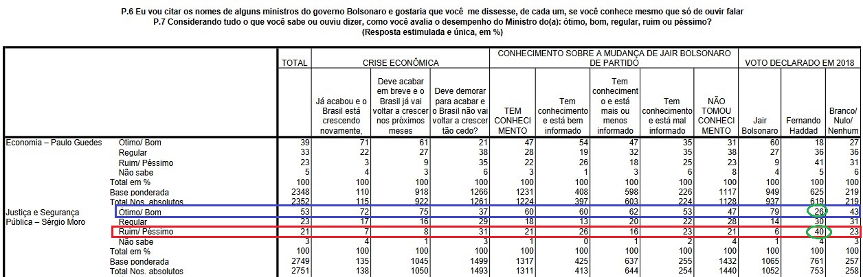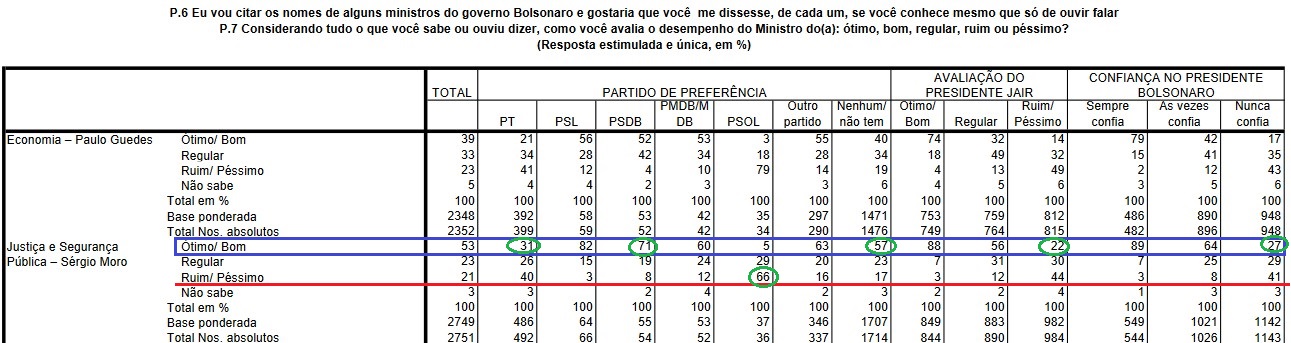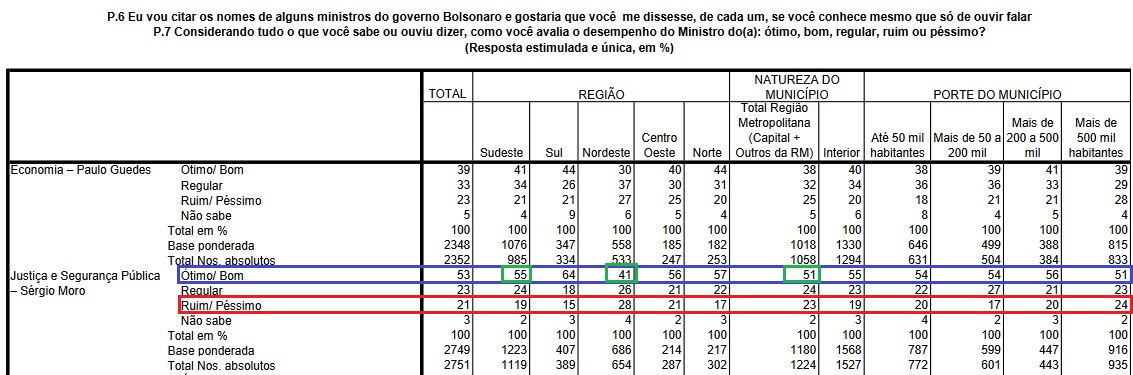 Eu separei as tabelas que tratam da avaliação entre aqueles que declararam conhecer os ministros Guedes e Moro. Vale atentar especialmente para Sergio Moro.