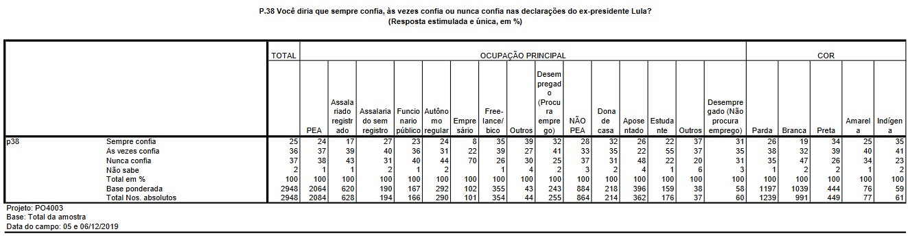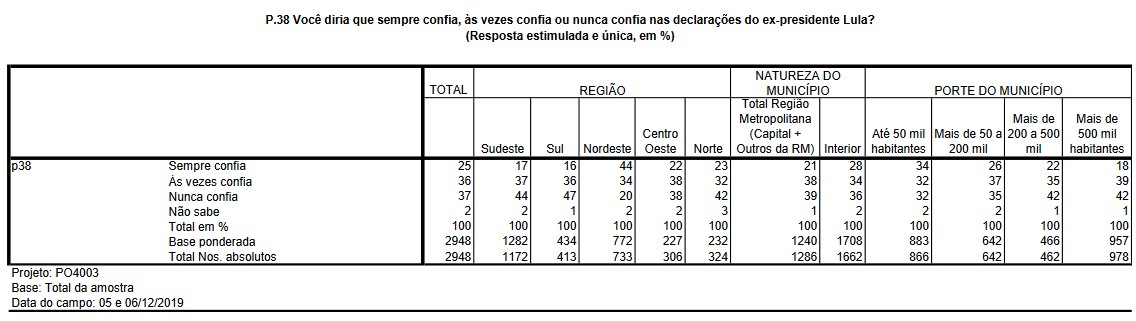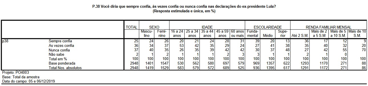 Nas tabelas referentes à confiança no ex-presidente, as proporções são muito similares às encontradas na pesquisa sobre sua liberdade.