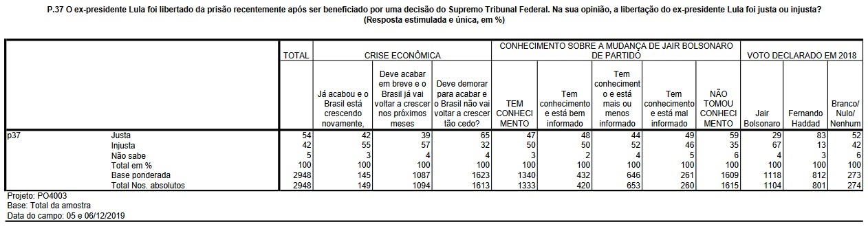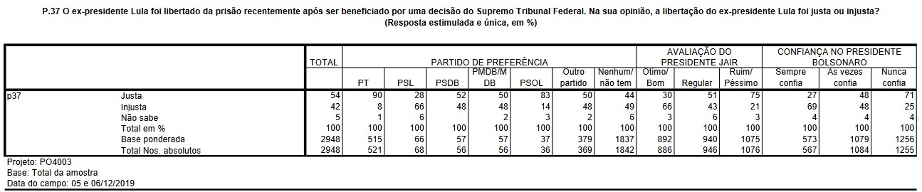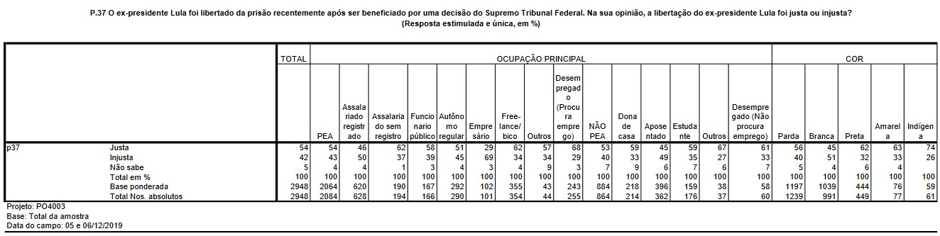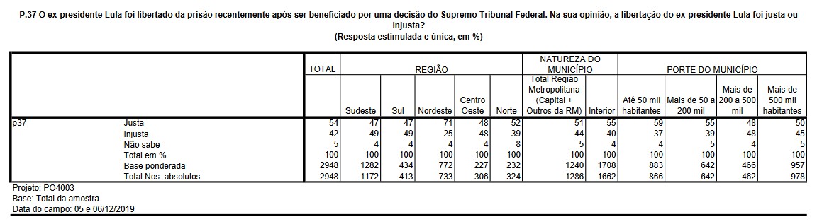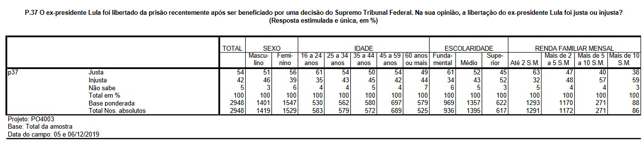 No total, uma maioria de 54% afirmou que sua liberdade é justa. O apoio à liberdade do ex-presidente é maior entre mais pobres, nordestinos, estudantes, mulheres e desempregados.