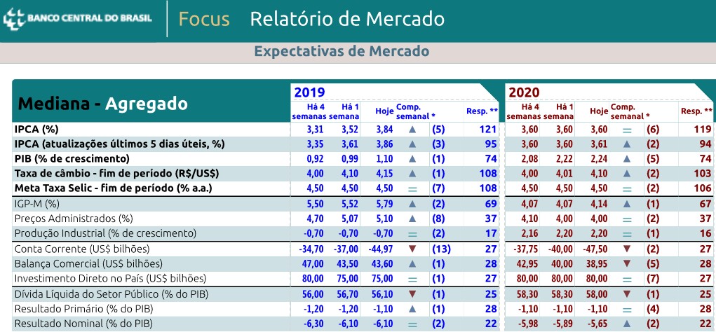 A inflação (IPCA) para 2019 foi reajustada ligeiramente para cima, para 3,84%.