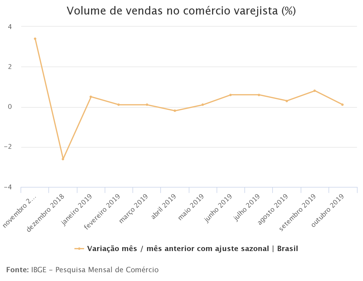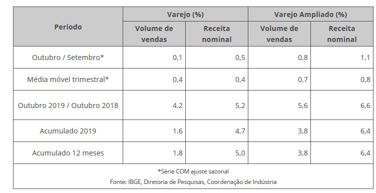 Agência IBGE — As vendas do comércio varejista desaceleraram para 0,1% em outubro, na comparação com setembro, segundo a Pesquisa Mensal de Comércio, divulgada hoje (11) pelo IBGE. Apesar da redução no ritmo, trata-se do sexto resultado positivo seguido do setor este ano, com ganho acumulado de 2,7% no período e de 4,2% frente a outubro de 2018. O índice de setembro foi revisado de 0,7% para 0,8%.
