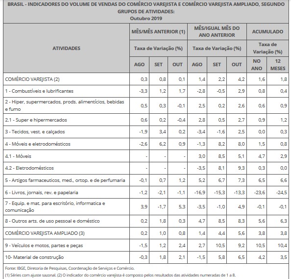 Em relação a outubro de 2018, o comércio varejista aumentou 4,2%, sétima taxa positiva seguida. Com isso, o varejo acumulou de janeiro a outubro avanço de 1,6%, frente a igual período do ano anterior. Já o indicador acumulado nos últimos 12 meses, ao passar de 1,6% em setembro para 1,8% em outubro, indica ganho de ritmo nas vendas, avaliou Isabella.