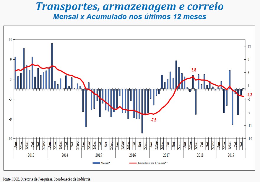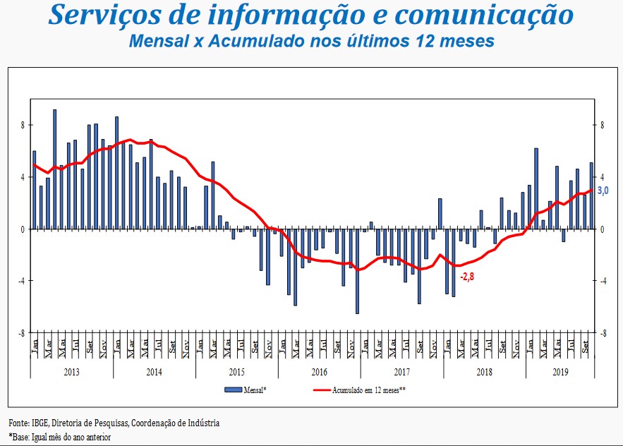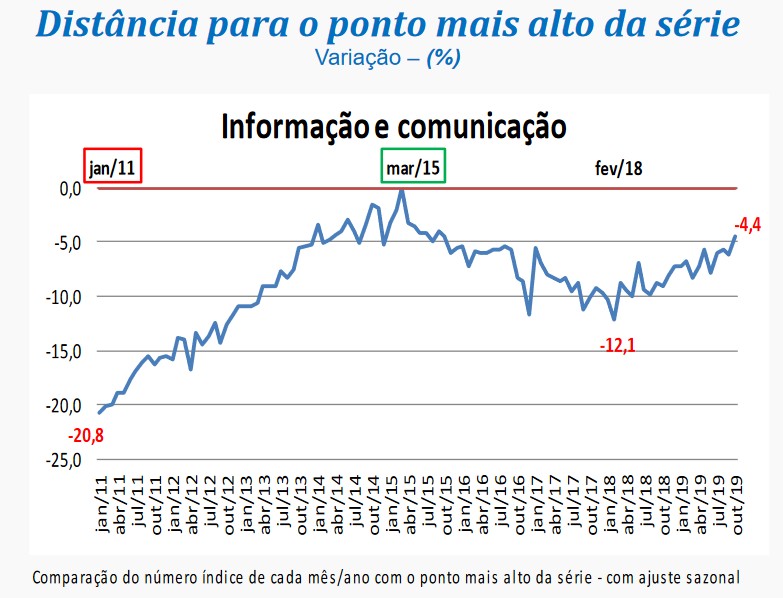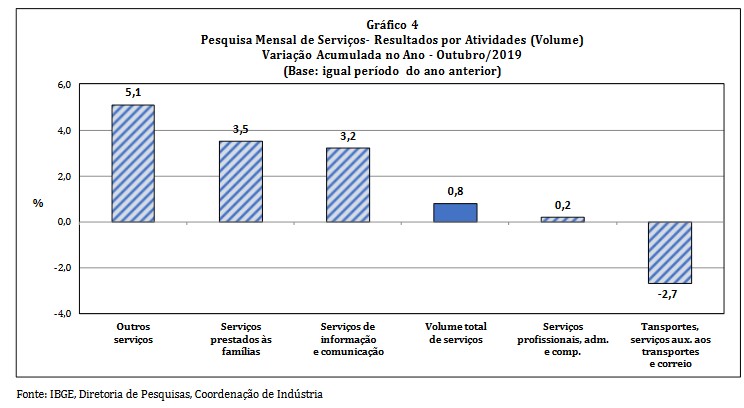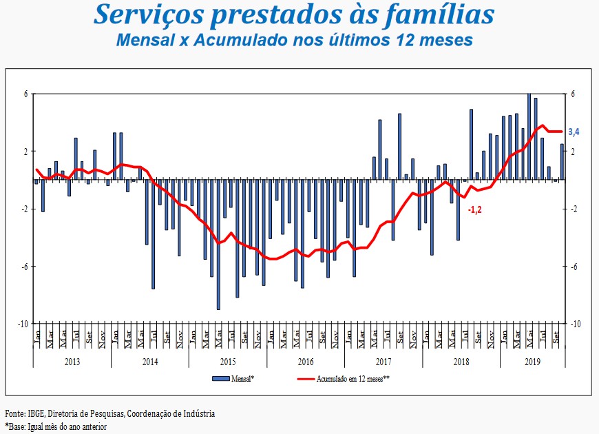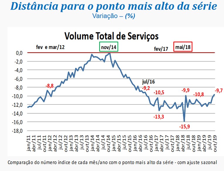 “O setor de serviços assinala um crescimento acumulado de 3% entre julho e outubro deste ano, revertendo a perda de 1,8% observada no período janeiro-junho de 2019 e avançando 1,2% frente ao patamar de dezembro de 2018. Vale observar que com a alta registrada neste mês, o setor atinge o patamar mais elevado desde julho de 2016, quando se encontrava 9,2% abaixo do ponto mais alto da série”, analisou o gerente da pesquisa, Rodrigo Lobo.