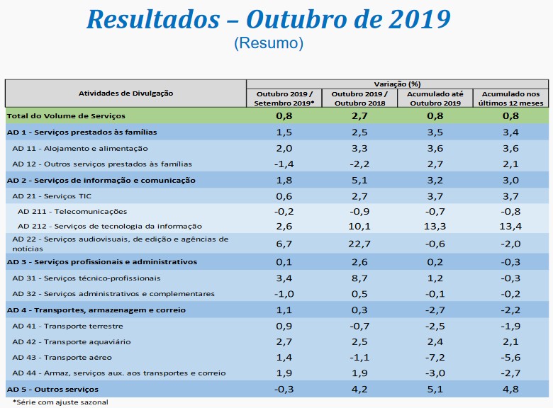 Já na comparação com outubro de 2018, o volume de serviços subiu 2,7% em outubro, com expansão em todas as cinco atividades de divulgação, em 88 dos 166 tipos de serviços pesquisados e de forma disseminada regionalmente, já que 17 das 27 unidades da federação avançaram frente a outubro do ano passado. Outubro teve um dia útil a mais do que o mesmo mês do ano passado, o que pode ter contribuído para uma maior efetivação de contratos de prestação de serviços.