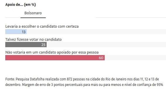Segundo a pesquisa, 13% dos entrevistados votariam “com certeza” num candidato apoiado por Bolsonaro, e mais 25% “talvez” votassem .