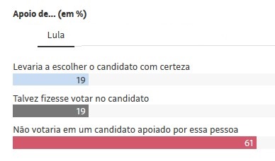 Entretanto, 19% responderam que votariam “com certeza” num candidato apoiado por Lula, o que é um percentual que pode garantir uma vaga no segundo turno.