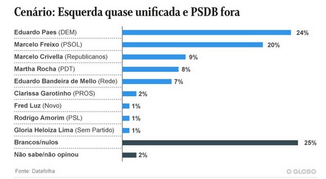 O Datafolha fez outros cenários. No caso de uma candidatura unificada de PT e PSOL, a pontuação de Freixo oscilaria 2 pontos para cima, mas também a de Paes subiria 2 pontos. Crivella e Martha igualmente oscilariam 1 ponto para cima.