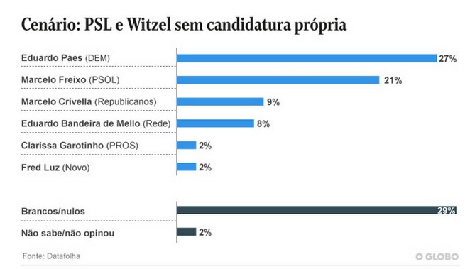 Num terceiro cenário, com ainda menos candidatos, sem Martha e sem um candidato representando o grupo político do governador Wilson Witzel, Paes subiria para 27%, abrindo uma diferença maior em relação a Freixo, que ficaria com 21%.