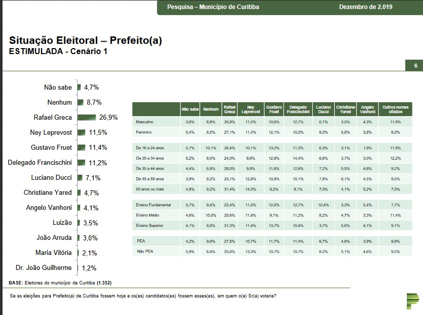 O Paraná Pesquisas divulgou hoje o relatório de sondagem de intenções de voto para as eleições municipais de 2020 em Curitiba, Paraná.