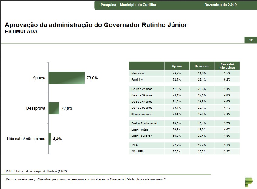 O governador Ratinho é aprovado por 74% dos eleitores curitibanos.