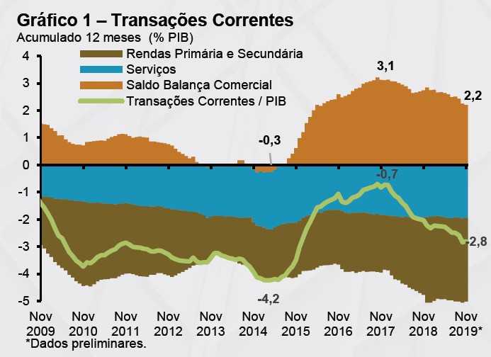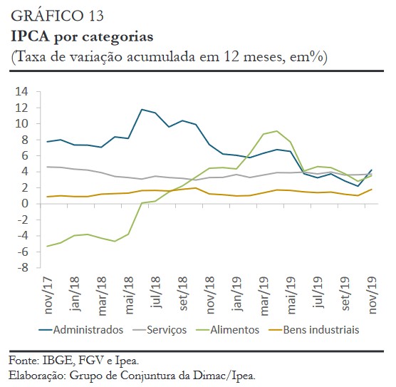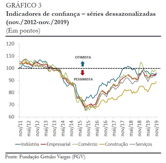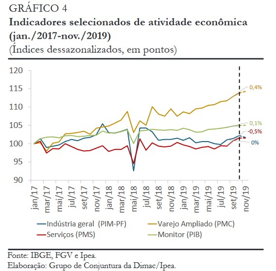 Neste último trimestre de 2019, a atividade econômica apresenta indicadores heterogêneos para indústria, comércio e serviços. Dados de novembro, ainda não fechados, indicam uma acomodação da produção industrial, com recuo de 0,5%. Por outro lado, a estimativa para as vendas no comércio (varejo) no mesmo período é de aumento do 0,4%, enquanto os serviços devem apresentar estabilidade em relação ao mês de outubro. A expectativa é de que o Produto Interno Bruto (PIB) mensal registre pequena elevação de 0,1% em novembro.