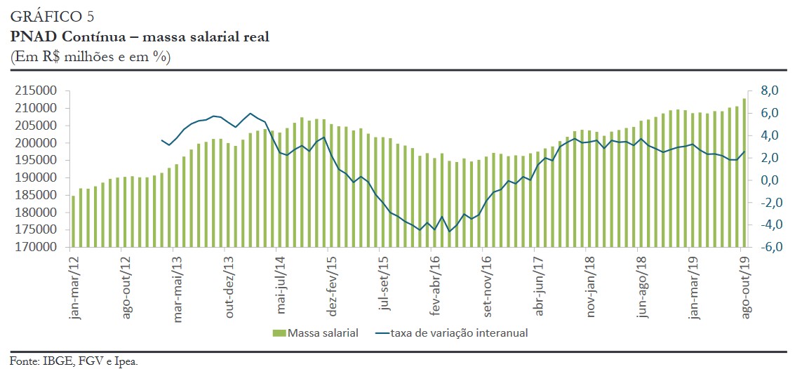 Segundo os pesquisadores, a economia em 2019 está sendo impulsionada pela demanda doméstica via consumo das famílias e investimento. A melhora no mercado de trabalho e a preponderância do PIB do setor privado em contraposição ao público contribuem para este cenário de crescimento, assim como a proposta de ampliação das regras para saque do FGTS.
