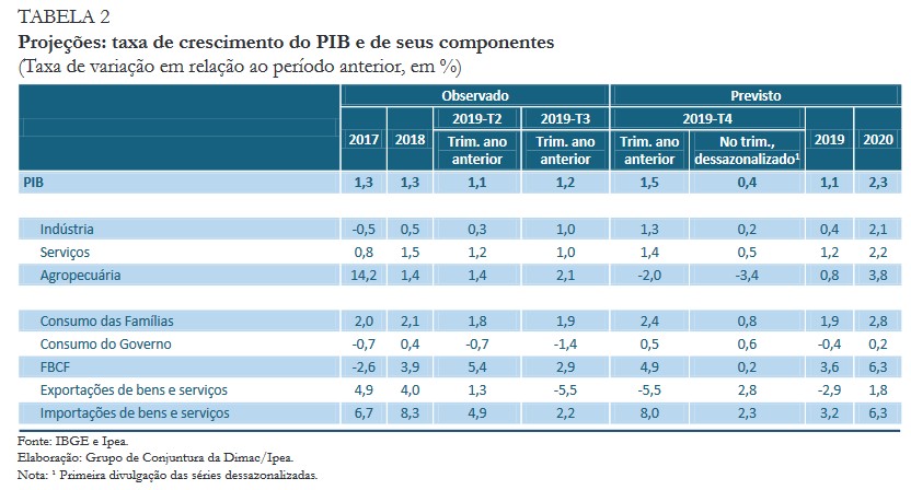 Ipea projeta PIB de 1,1% em 2019 e de 2,3% para 2020