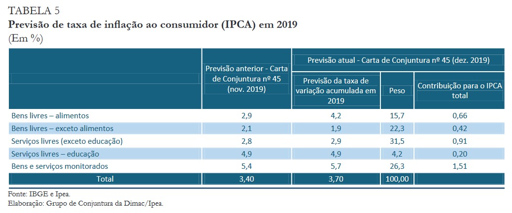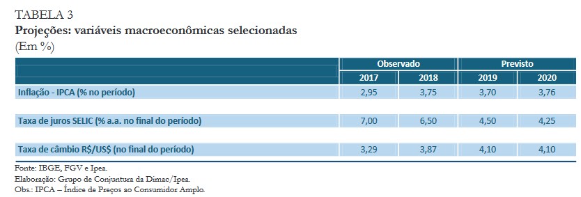 As projeções de inflação também foram revisadas. Para 2019, a expectativa é de 3,7%, 0,30 pontos percentuais acima da previsão anterior. Para 2020, a projeção também teve um pequeno aumento: de 3,7% a.a. para 3,76% a.a.