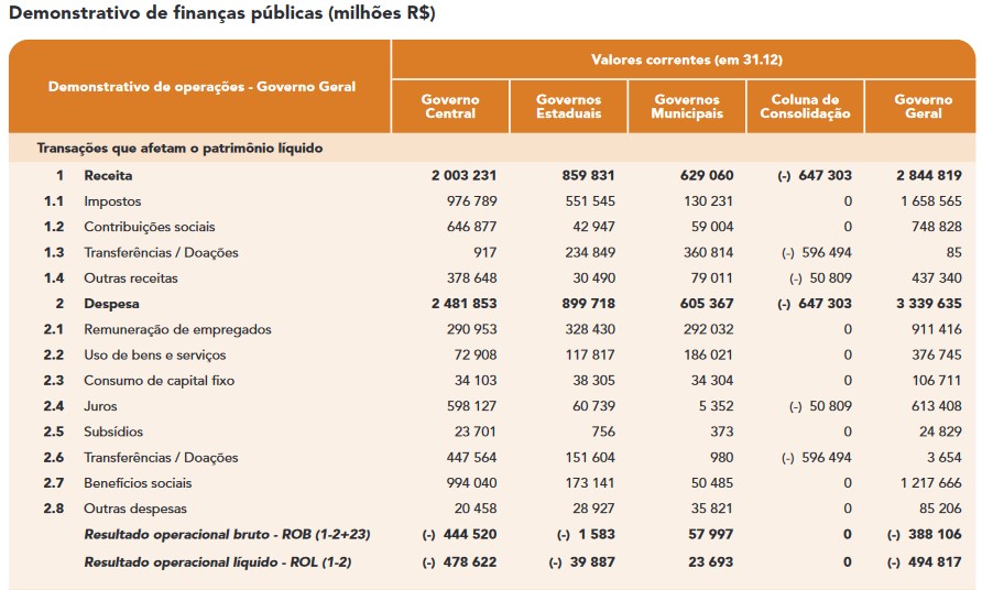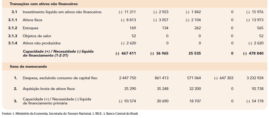 Em 2018, a Necessidade de Financiamento Líquida do Governo Geral registrada nas Estatísticas de Finanças Públicas foi de R$ 478,8 bilhões, apresentando uma queda de 12,4% em relação a 2017. Este resultado se deve ao crescimento de 8,2% da receita total em contraposição a uma variação de 4,2% das despesas totais das três esferas de governo.