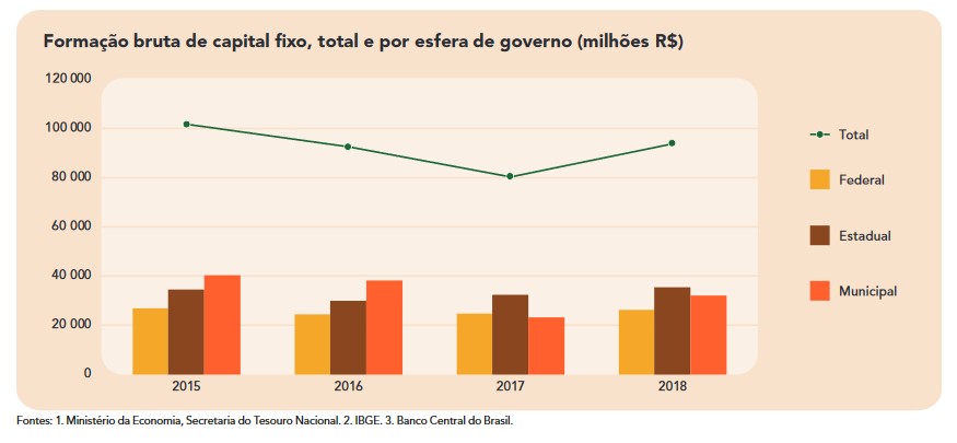 A Formação Bruta de Capital Fixo (FBCF), captada na Conta Intermediária de Governo, cresceu em todas as esferas de governo, passando de R$ 80,3 bilhões para R$ 93,9 bilhões, uma variação positiva de 16,9%. Esta variação foi mais elevada especialmente pelos gastos dos governos municipais, que no ano anterior haviam registrado queda de cerca de 40% nos investimentos e observaram elevação de 38,7% em 2018. Os governos estaduais registraram elevação de 9,4%, mantendo variação próxima a do ano anterior, enquanto o governo federal apresentou variação positiva de 6,5%, frente a um crescimento de 0,9% observado no ano anterior.