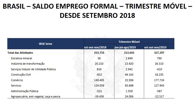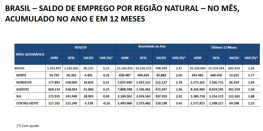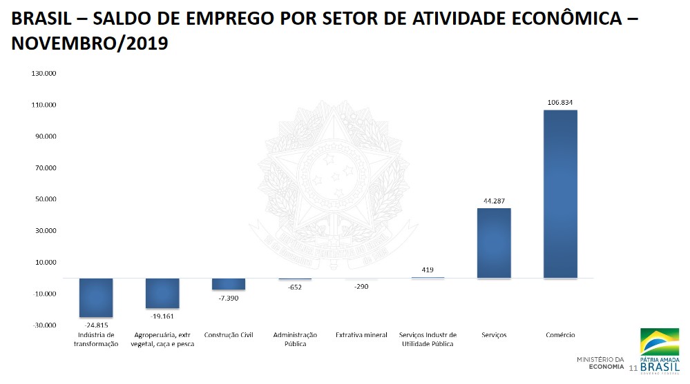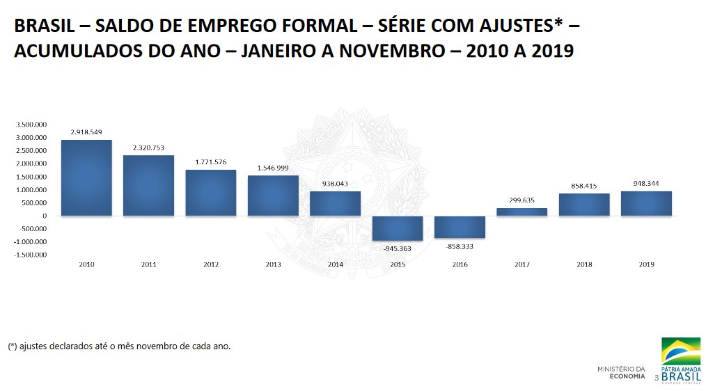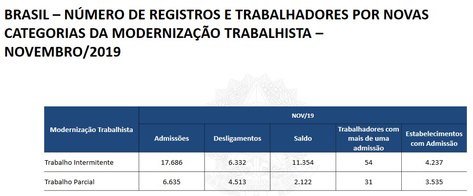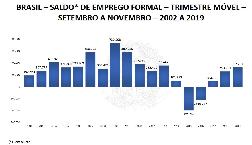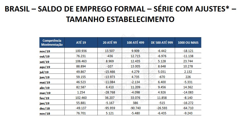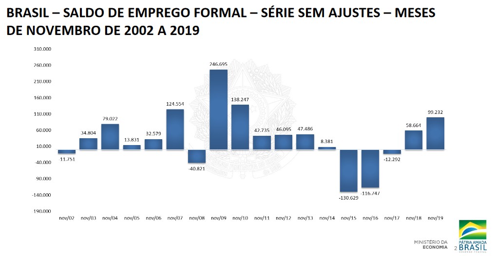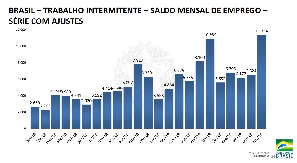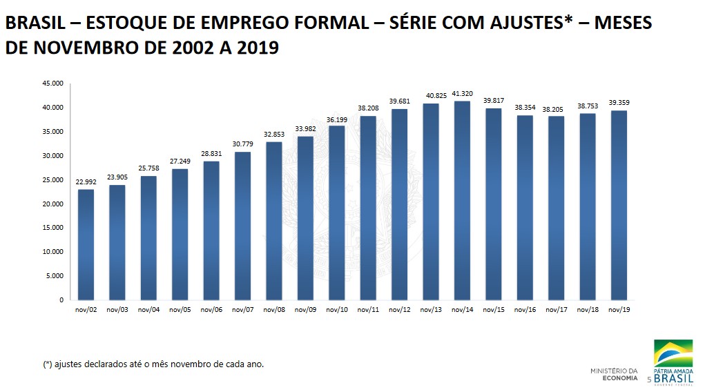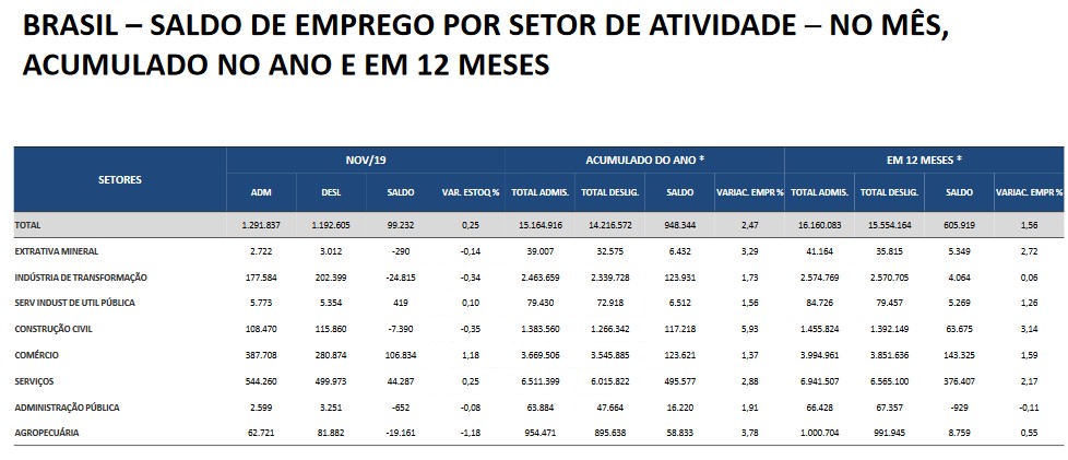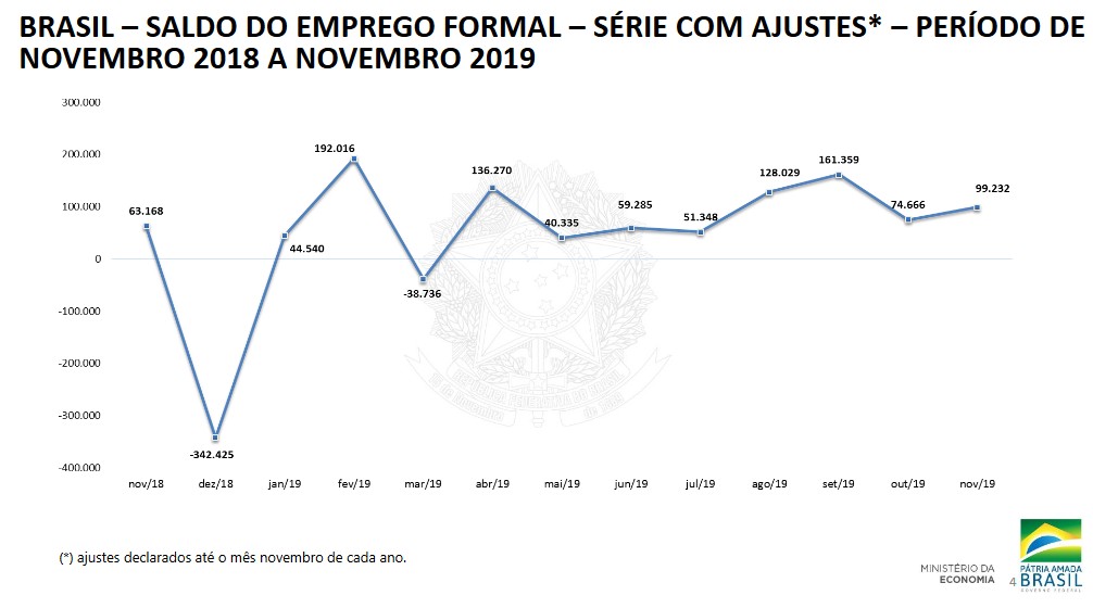 Divulgado nesta quinta-feira (19) pela Secretaria Especial de Previdência e Trabalho do Ministério da Economia, o Caged ainda traz um estoque total de empregos de 39,3 milhões, superior aos 38,7 milhões registrados em novembro de 2018. Outro destaque é a modalidade de trabalho intermitente, que teve mais de 11 mil contratações no mês.