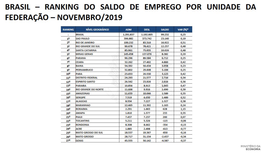 Das 27 unidades da federação, 21 tiveram variação positiva. São Paulo registrou o maior saldo positivo, com a geração de 23.140 novos postos; Rio de Janeiro, com 16.922, e Rio Grande do Sul com 12.257.