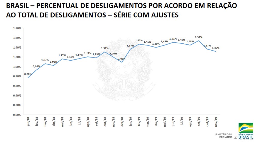 Os dados do Caged mostram que em novembro houve 15.754 desligamentos mediante acordo entre empregador e empregado. Entre os setores econômicos, os desligamentos ocorreram principalmente em Serviços (8.147), Comércio (3.635) e Indústria de Transformação (2.452).