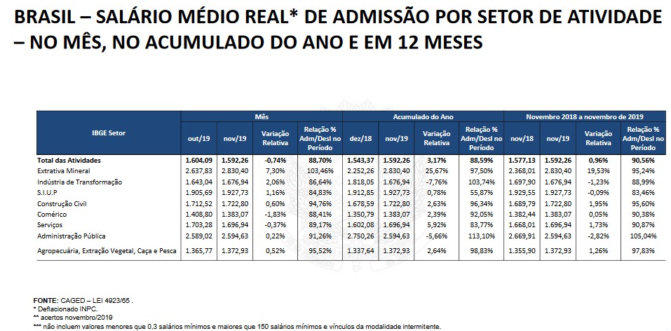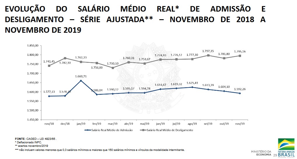 O salário médio de admissão nacional foi de R$ 1.592,26 e o salário médio de desligamento foi de R$ 1.795,16. Em termos reais (mediante deflacionamento pelo INPC), registrou-se crescimento de 0,96% para o salário médio de admissão e de 3,08% para o salário de desligamento, na comparação com novembro do ano passado.