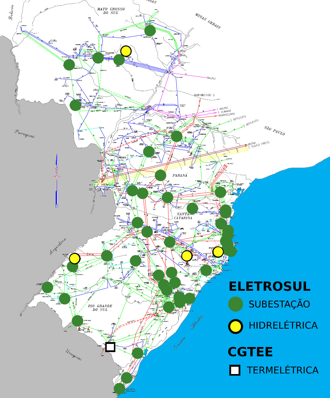 Na imagem, podemos ver a CGTEE que possui apenas uma usina Termelétrica, representada na parte baixa do mapa por um quadrado. As instalações da Eletrosul, com energia 100% limpa, estão representadas pelos círculos e espalhadas pelos estados do Rio Grande do Sul, Santa Catarina, Paraná e Mato Grosso do Sul.