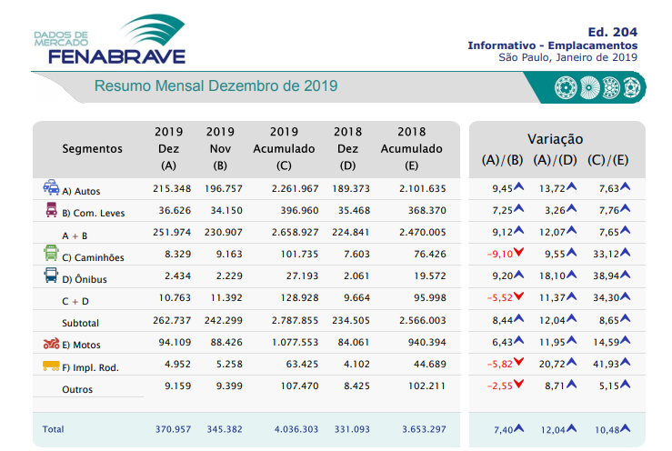 “Esse desempenho positivo (de 2019) se deve a alguns fatores econômicos, como taxa de juros menores e à queda nos índices de inadimplência e de desemprego, o que refletiu, diretamente, no aumento da confiança do consumidor e, também, do empresário brasileiro”, disse o presidente da Fenabrave, Alarico Assumpção Júnior, em comunicado à imprensa.
