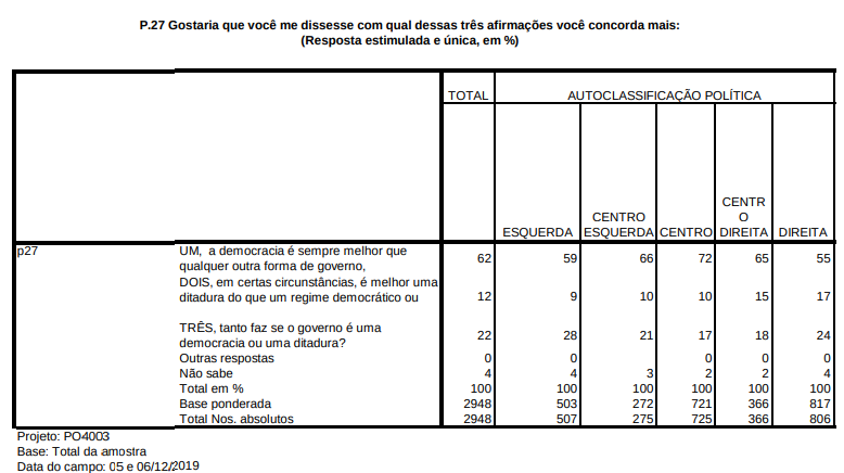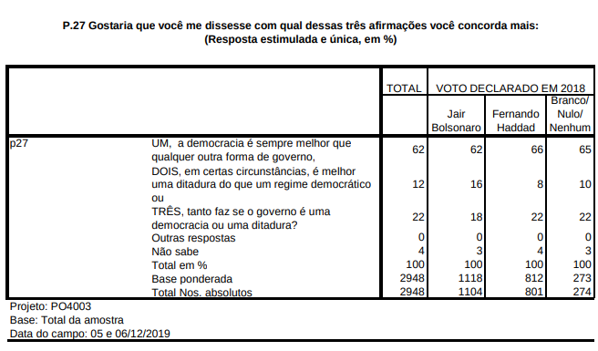 Na pesquisa de agora, feita no início de dezembro de 2019, o número recuou para 62%, o que é um número bem acima da média dos últimos anos. Para efeito de comparação, em 1989, um ano após a promulgação da Constituição de 1988, o apoio ao regime democrática era de apenas 43%, e seguirá oscilando abaixo de 50% (com alguns picos acima disso) até a eleição de Lula, em 2002, a partir do que a média fica mais próxima de 60%, até hoje.