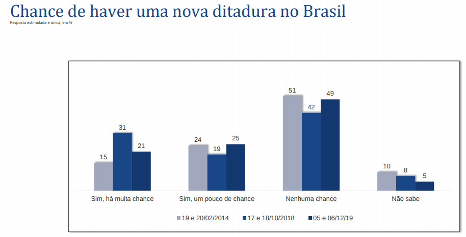 O medo de que Bolsonaro implementasse uma ditadura arrefeceu de 31% em outubro de 2018, para 21% hoje. E o percentual dos que consideram que não há “nenhuma chance” de que haja uma nova ditadura no Brasil subiu de 42% em outubro de 2018 para 49% hoje, número parecido com o do início de 2014.