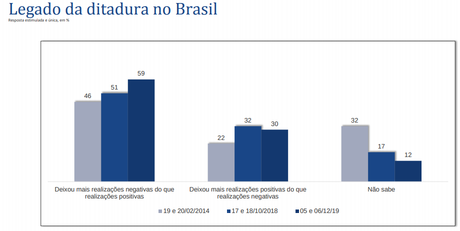 O gráfico relativo ao “legado da ditadura no Brasil”, por sua vez, mostra uma piora expressiva da imagem do regime militar: hoje temos 59% dos brasileiros que vêem a ditadura como negativa; em outubro de 2018, esse número era 51%, e em 2014, 46%.