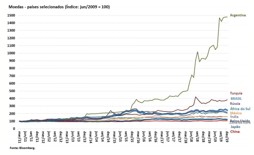 A desvalorização cambial da moeda argentina é o fato que mais chamou atenção em 2019. No Brasil também houve desvalorização acima de muitos outros países (o que também, quando não afeta a inflação, não é ruim, pois dá fôlego à indústria).