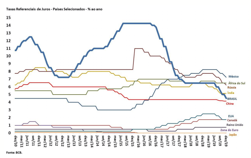 A linha azul do gráfico abaixo, referente aos juros, mostra como o Brasil se manteve, durante quase todo o período de 2010 à primeira metade de 2017 como o país com as taxas de juro mais elevadas do mundo. Hoje as taxas estão bem próximas ao nível praticado na China, abaixo da Índia, mas ainda muito acima dos juros observados nas economias ocidentais mais desenvolvidas.