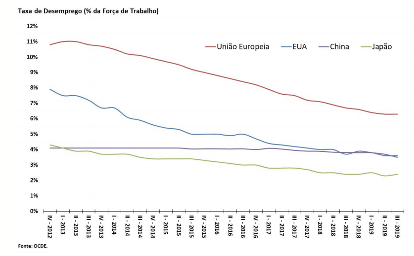 As taxas de desemprego estão declinantes nas principais economias europeias. Especialistas tem apontado falhas na qualidade do emprego, em função da substituição de trabalho por humano por computadores, robôs e sistemas de inteligência artificial, mas considerando a quantidade de emprego, a situação ainda está sob controle e até melhor que antes.
