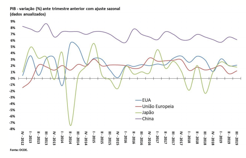 Na tabela abaixo, clique para expandir e conferir as taxas de crescimento da produção industrial das principais economias, que registrou índices vigorosos nos Estados Unidos (2,1%) e na China (5,8%) em 2019.