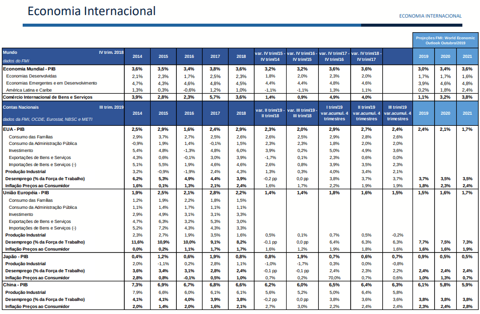 O relatório macroeconômico divulgado hoje pelo ministério da Economia traz gráficos com números e projeções para algumas das principais economias do mundo.
