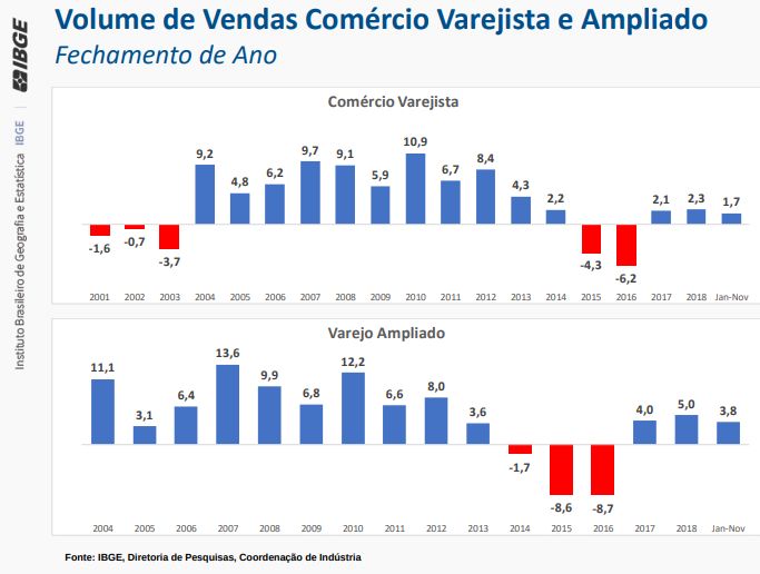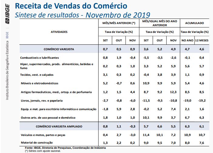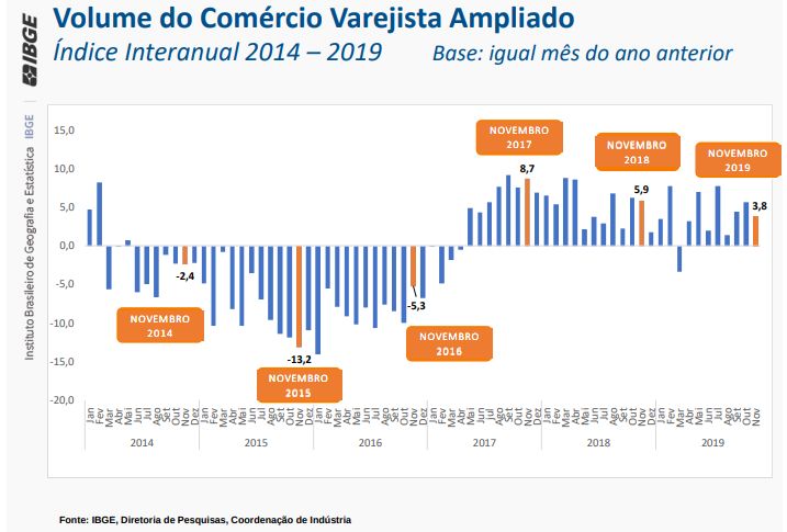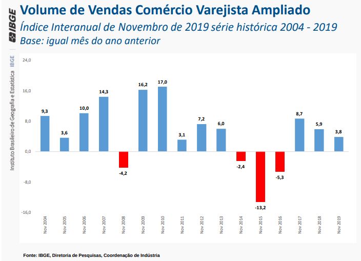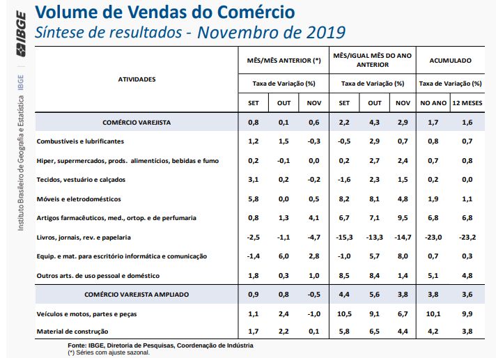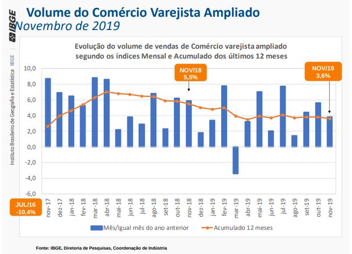 Na comparação com novembro de 2018, o varejo cresceu 2,9%, oitava taxa positiva seguida. Com isso, o setor acumulou avanço de 1,7% de janeiro a novembro de 2019, em relação ao igual período do ano anterior. O indicador acumulado nos últimos 12 meses, ao passar de um avanço de 1,8% em outubro para 1,6% em novembro, sinalizou perda de ritmo nas vendas.
